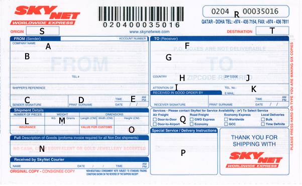 U - Refer the Reverse side of the Airway Bill for Terms & Conditions
